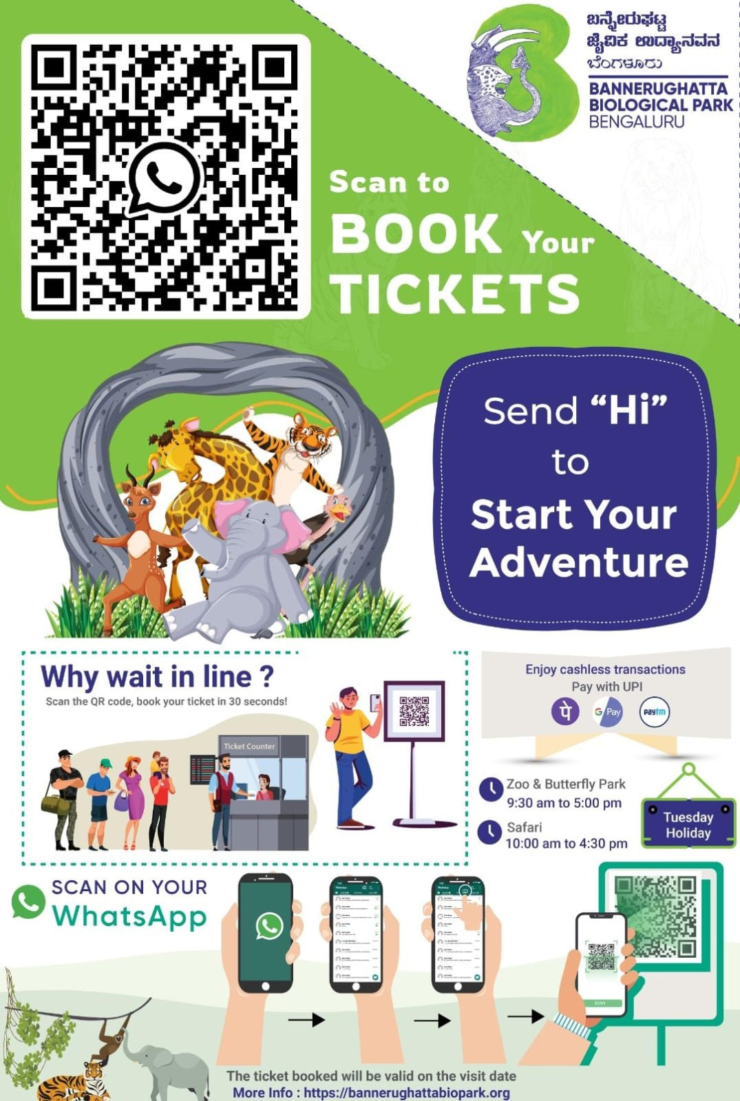 ಬನ್ನೇರುಘಟ್ಟ ಜೈವಿಕ ಉದ್ಯಾನವನವು 2024ರ ವಿಶ್ವ ವನ್ಯಜೀವಿ ದಿನಾಚರಣೆಯ ಸಂದರ್ಭದಲ್ಲಿ ತನ್ನ ಆನ್ಲೈನ್ ಟಿಕೆಟ್ ಬುಕಿಂಗ್ ವ್ಯವಸ್ಥೆಯನ್ನು ವಾಟ್ಸಾಪ್ ಮೂಲಕ ಘೋಷಿಸಲು ಸಂತೋಷವಾಗಿದೆ. ಮಾರ್ಚ್ 3, 2024 ರಿಂದ, ಮೃಗಾಲಯ, ಸಫಾರಿ ಮತ್ತು ಬಟರ್ಫ್ಲೈ ಪಾರ್ಕ್ಗೆ ಭೇಟಿ ನೀಡಲು ಯೋಜಿಸುವ ಪ್ರವಾಸಿಗರು ತಮ್ಮ ಟಿಕೆಟ್ಗಳನ್ನು ಮುಂಗಡವಾಗಿ ಬುಕ್ ಮಾಡಬಹುದು. WhatsApp ನಲ್ಲಿ ನಮ್ಮ ಬಳಕೆದಾರ ಸ್ನೇಹಿ ಟಿಕೆಟಿಂಗ್ ವ್ಯವಸ್ಥೆ. ಅವರ ಟಿಕೆಟ್ಗಳನ್ನು ಸಂದರ್ಶಕರ ವಾಟ್ಸಾಪ್ ಸಂಖ್ಯೆ ಮತ್ತು ಅವರ ಇಮೇಲ್ ಐಡಿಗೆ ಕಳುಹಿಸಲಾಗುತ್ತದೆ, ಅದನ್ನು ಪಾರ್ಕ್ ಪ್ರವೇಶದ್ವಾರದಲ್ಲಿ ಸ್ಕ್ಯಾನ್ ಮಾಡಲಾಗುತ್ತದೆ ಮತ್ತು ಮೌಲ್ಯೀಕರಿಸಲಾಗುತ್ತದೆ.