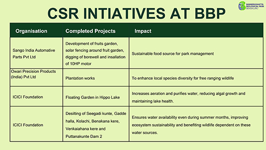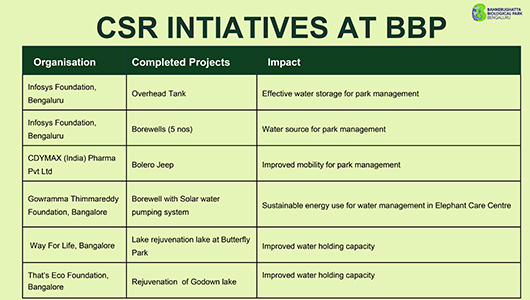 Bannerughatta Biological Park (BBP), a unit of Zoo Authority of Karnataka (ZAK), Government of Karnataka, is situated in Bengaluru. The main objective of ex-situ conservation through education, conservation breeding, research, rescue and rehabilitation. CSR contribution can further support to strengthen the organisation’s mission